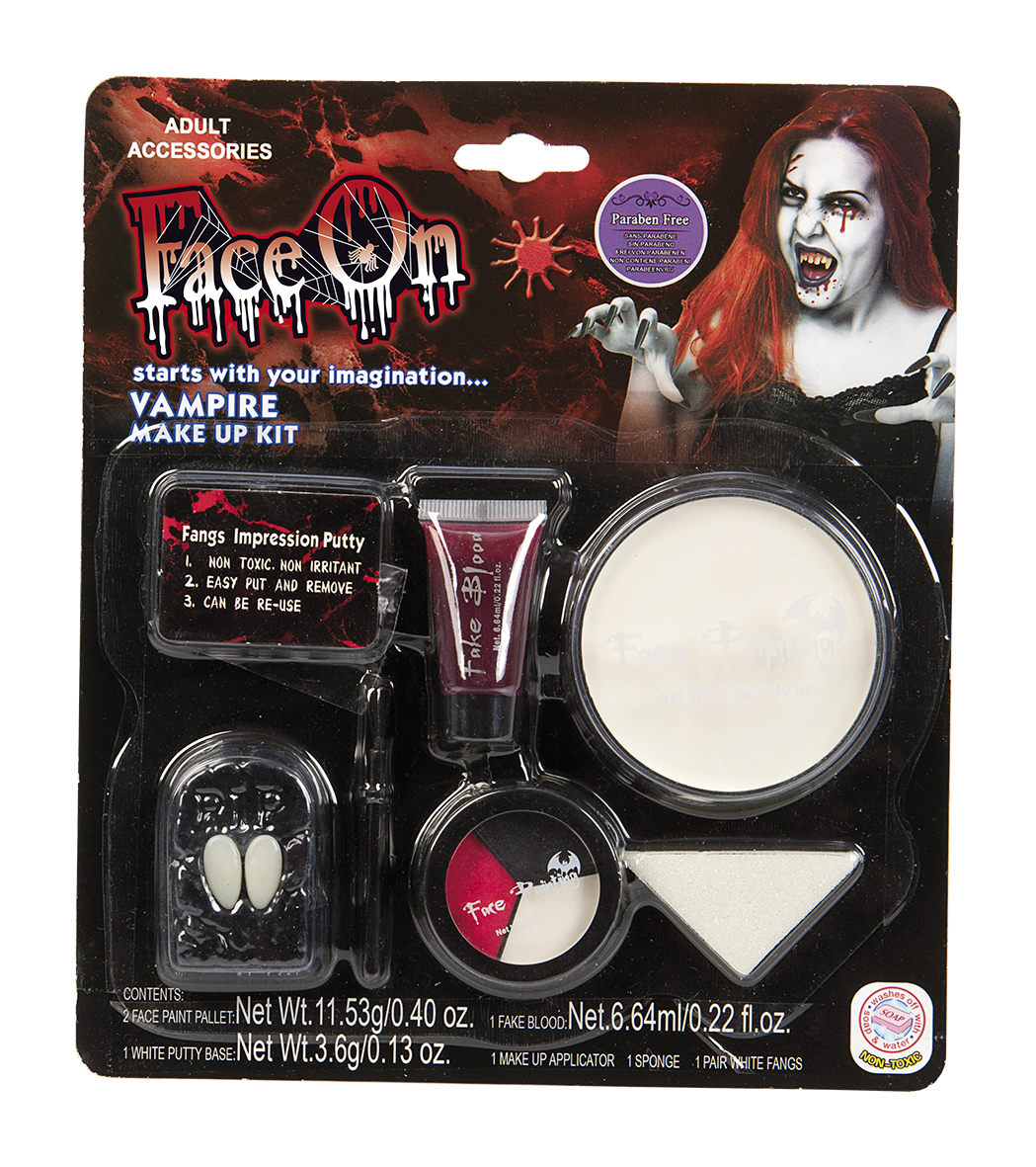 Meikkisetti Vampyyri. Sisältää teatteriverta (6,6 ml), öljypohjaisia kasvomaaleja (valkoinen, musta, punainen), siveltimen, sienen ja hammassetin, jossa kaksi hammasta. Lapset saavat käyttää tuotetta vain aikuisen valvonnassa